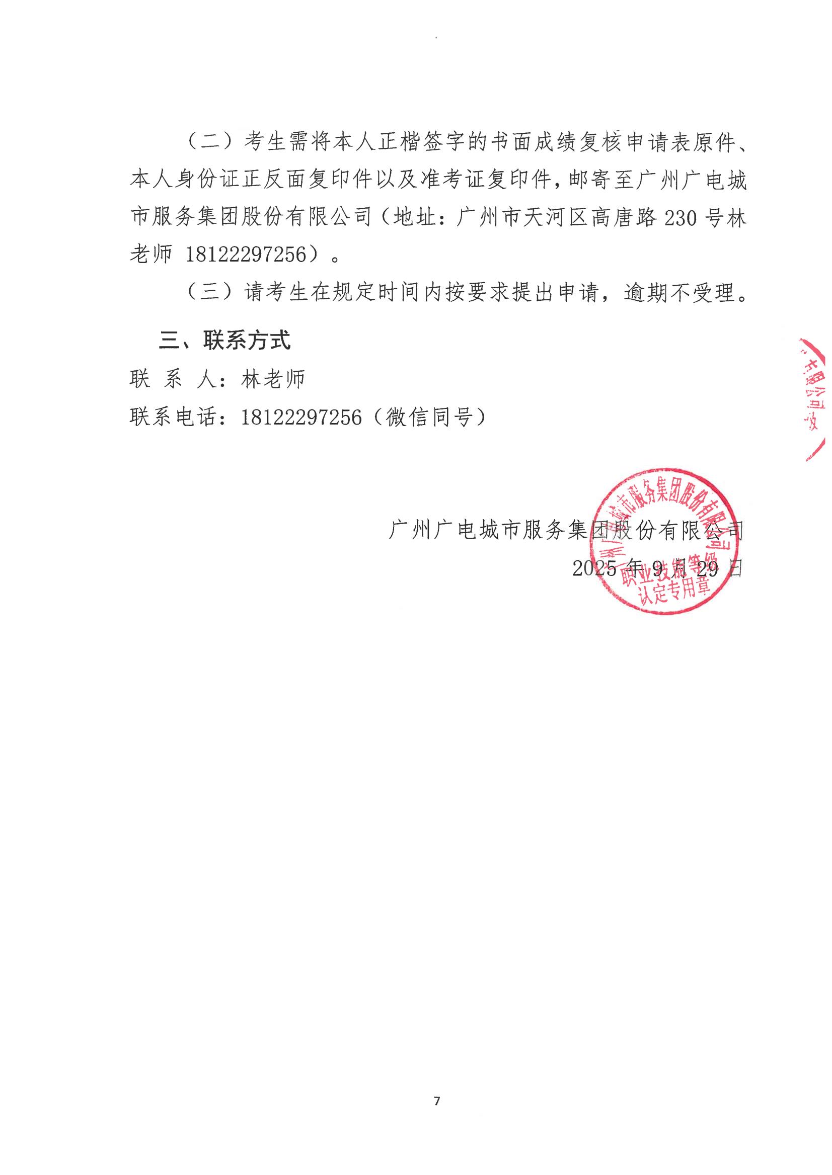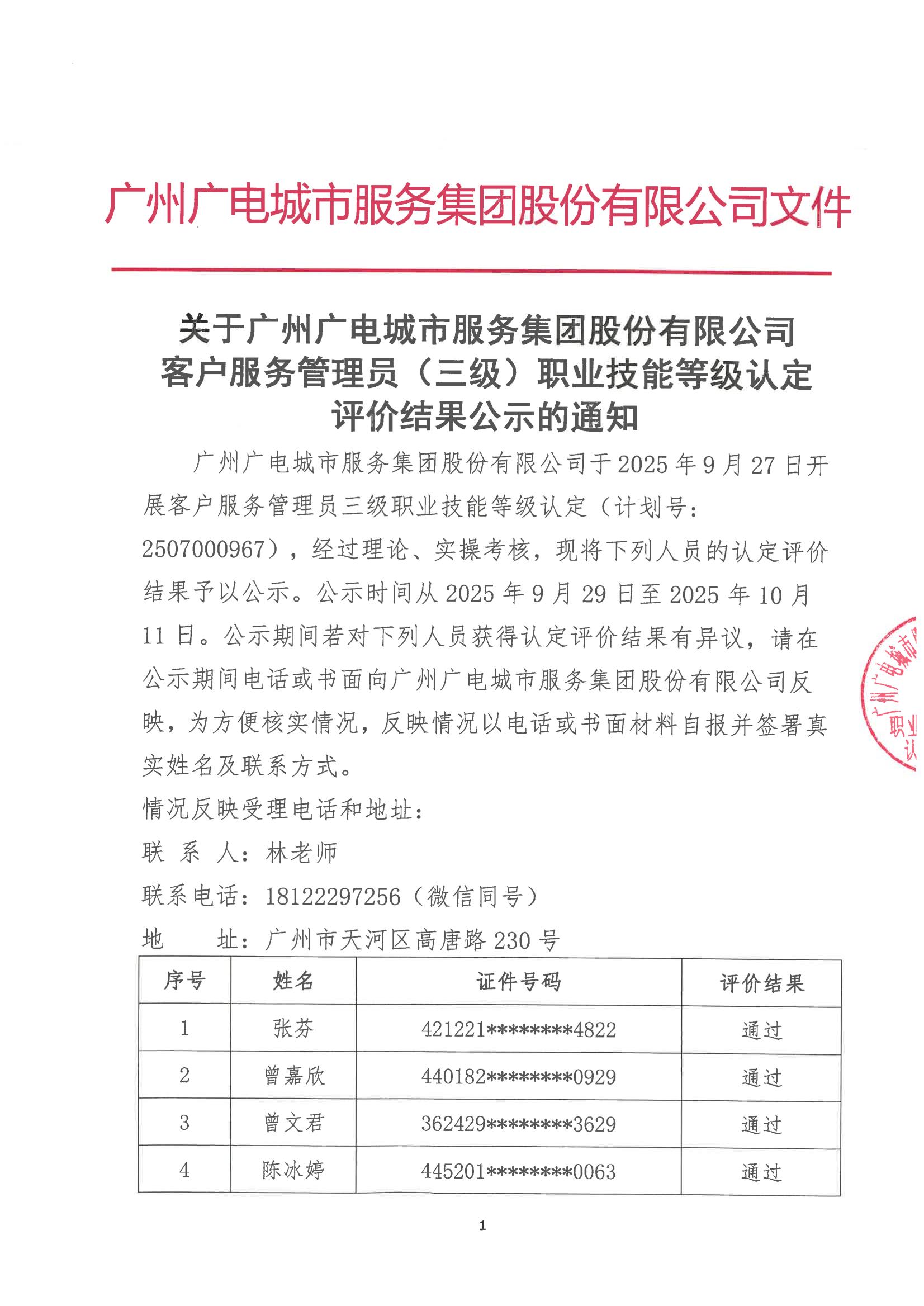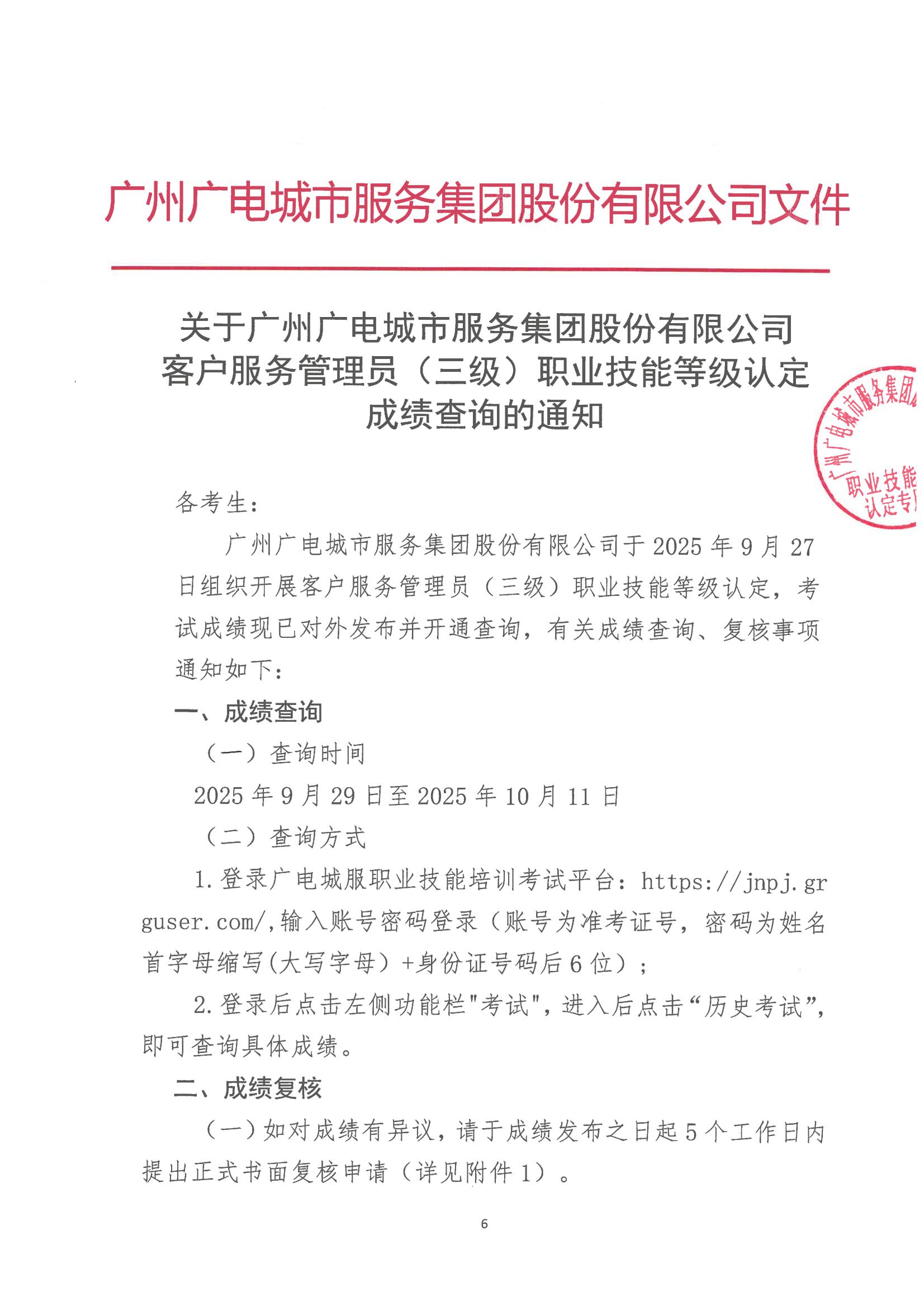 广州广电城市服务集团股份有限公司2507000967客户服务管理员(三级)认定结果公示和成绩查询通知